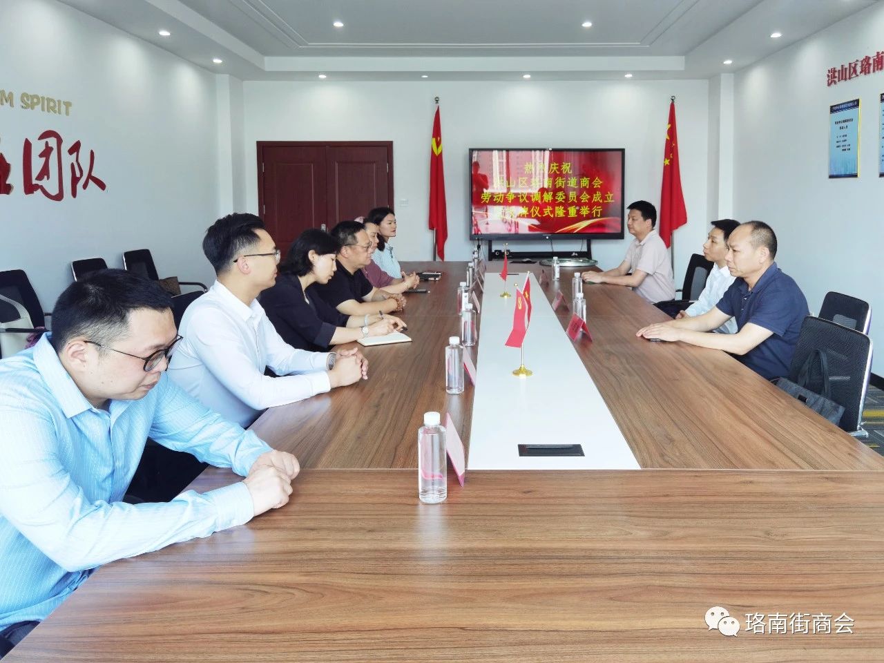 6月6日下午,武漢市洪山區珞南街街道商會勞動爭議調解委員會成立暨授牌儀式在天宇創意大廈1號樓9樓隆重舉行,區政府副區長張俊峰,區人力資源局局長李應清,區人力資源局仲裁辦主任李林,商會會長、武漢科銳芯電子科技有限公司董事長駱為民,黨支部書記張娜,秘書長楊麗萍,副會長楊威等出席了此次授牌儀式。
