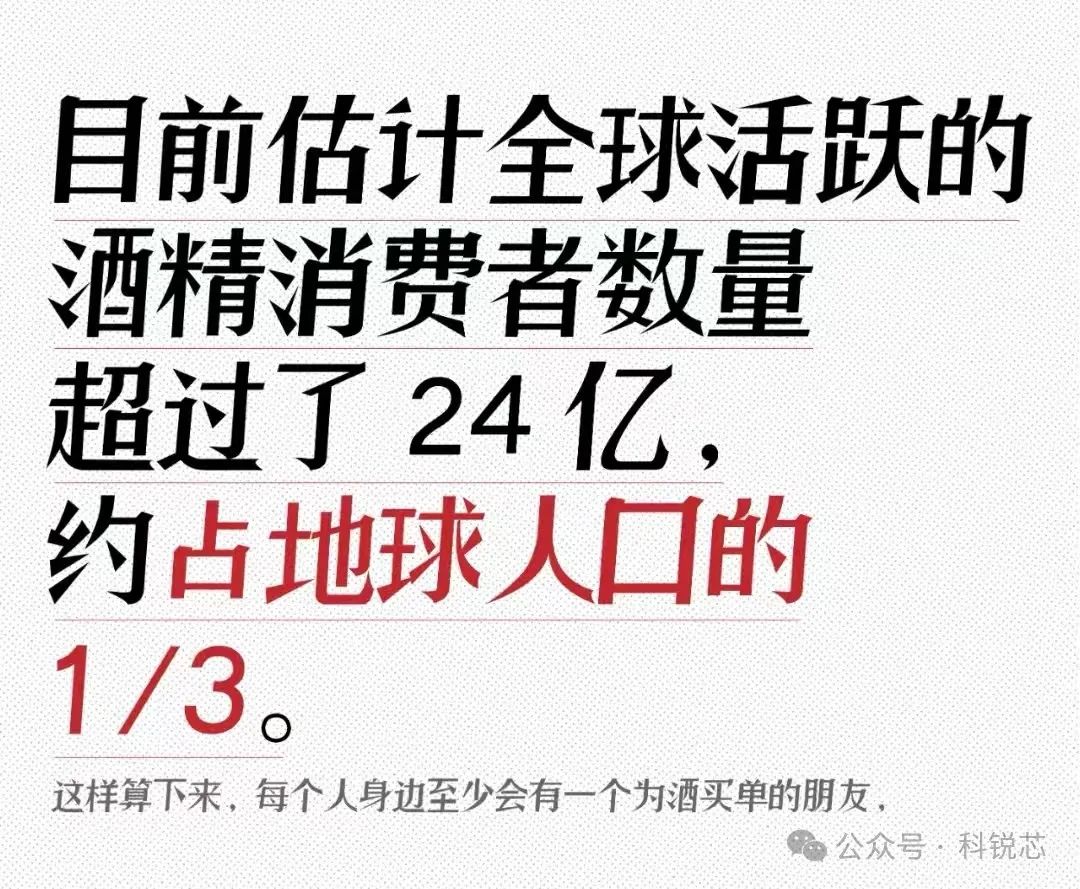 我們用數據說話,目前估計全球活躍的酒精消費者數量超過了24億,約占地球人口的1/3。這樣算下來,每個人身邊至少會有一個為酒買單的朋友。