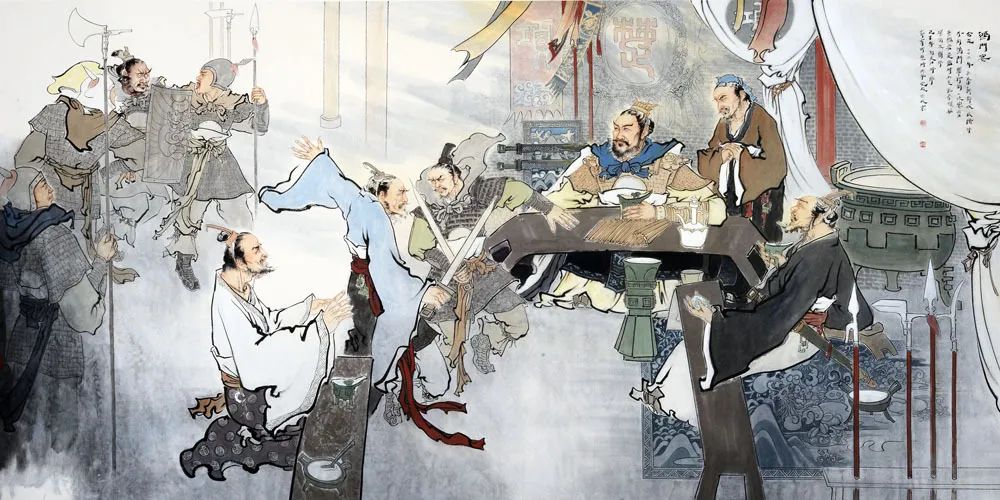 公元前206年劉邦先入關滅秦進駐咸陽,并派兵守函谷關,以拒項羽西進。項羽率大軍至,破函谷關,進駐鴻門,準備襲擊劉邦。劉邦因勢力懸殊,采納張良建議,結交項羽叔父項伯,請予調解,以作緩兵計,并親至鴻門會見項羽。在宴會上,項羽謀士范增令項莊舞劍,欲刺殺劉邦。項伯急拔劍起舞,以身掩護,后劉邦部將樊噲帶劍執盾闖入護衛,劉邦得以脫險。這次宴會史稱鴻門宴。